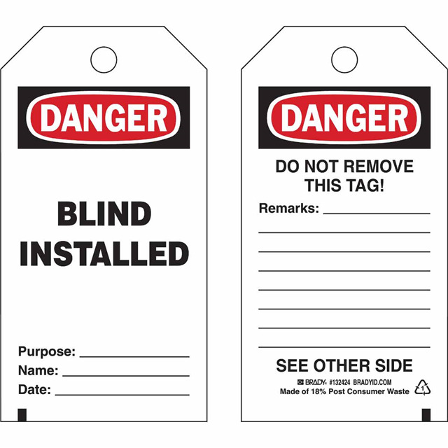 This is manufactured by Brady Corporation. The manufacturer part number is 132424. Label with a size of 5.75" l x 3.00" w (146.0mm x 76.2mm). The product is not applicable. It has a classic black and red legend, white background colour. The product brady®, is a highly preferred choice for users. The product is made from highly stable and reliable polyester. In addition, it is reach unaffected. Its typical moisture sensitivity level is not applicable. In addition, bulk is the available packaging type of the product. A bespoke label is a danger. blind installed purpose. name. date. label. The product is suitable for use with danger. It has a long 4 weeks standard lead time. The brady corporation's product offers user-desired applications.