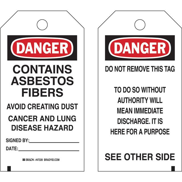 This is manufactured by Brady Corporation. The manufacturer part number is 48184. Label with a size of 5.75" l x 3.00" w (146.0mm x 76.2mm). The product is not applicable. It has a classic black and red legend, white background colour. The product brady®, is a highly preferred choice for users. The product is made from highly stable and reliable paper. In addition, it is reach unaffected. Its typical moisture sensitivity level is not applicable. In addition, bulk is the available packaging type of the product. A bespoke label is a danger. contains asbestos fibers avoid creating dust cancer and lung disease hazard signed by. date. label. The product is suitable for use with danger. It has a long 4 weeks standard lead time. The brady corporation's product offers user-desired applications.
