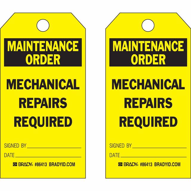 This is manufactured by Brady Corporation. The manufacturer part number is 86413. Label with a size of 5.75" l x 3.00" w (146.0mm x 76.2mm). The product is rohs3 compliant. It is shipped in bulk package . It has a classic black legend, yellow background colour. The product brady®, is a highly preferred choice for users. The product is made from highly stable and reliable polyester. In addition, it is reach unaffected. Its typical moisture sensitivity level is not applicable. A bespoke label is a maintenance order. mechanical repairs required signed by. date. label. It has a long 4 weeks standard lead time.