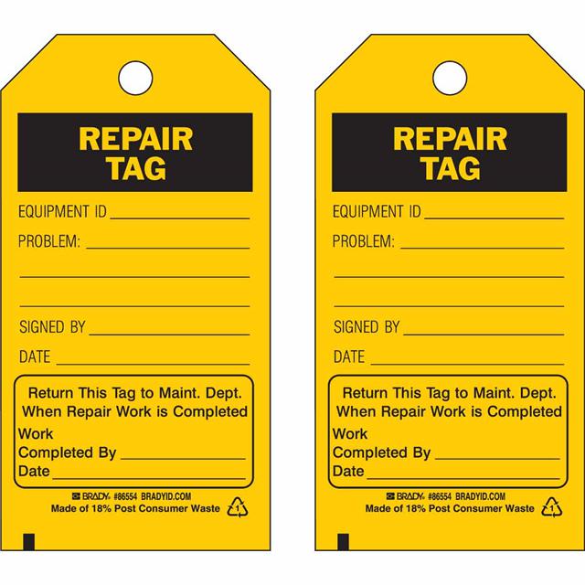 This is manufactured by Brady Corporation. The manufacturer part number is 86434. Label with a size of 5.75" l x 3.00" w (146.0mm x 76.2mm). The product is rohs3 compliant. It has a classic black legend, yellow background colour. The product brady®, is a highly preferred choice for users. The product is made from highly stable and reliable polyester. In addition, it is reach unaffected. Its typical moisture sensitivity level is not applicable. In addition, bulk is the available packaging type of the product. A bespoke label is a repair tag. equipment id. problem. signed by. date. return this tag to maint. dept. when repair work is completed work completed by. date. label. It has a long 4 weeks standard lead time. The brady corporation's product offers user-desired applications.