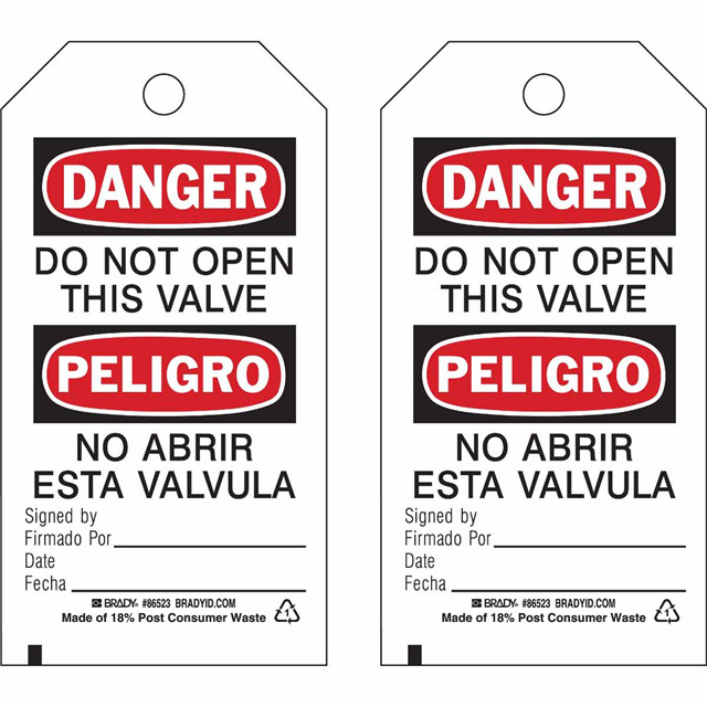 This is manufactured by Brady Corporation. The manufacturer part number is 86633. Label with a size of 5.75" l x 3.00" w (146.0mm x 76.2mm). The product is not applicable. It has a classic black and red legend, white background colour. The product brady®, is a highly preferred choice for users. The product is made from highly stable and reliable paper. In addition, it is reach unaffected. Its typical moisture sensitivity level is not applicable. In addition, bulk is the available packaging type of the product. A bespoke label is a danger/peligro. do not open this valve no abrir esta valvula signed by firmado por. date fecha. label. The product is suitable for use with danger. It has a long 4 weeks standard lead time. The brady corporation's product offers user-desired applications.