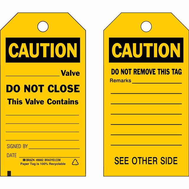 This is manufactured by Brady Corporation. The manufacturer part number is 86662. Label with a size of 5.75" l x 3.00" w (146.0mm x 76.2mm). The product is not applicable. It has a classic black legend, yellow background colour. The product brady®, is a highly preferred choice for users. The product is made from highly stable and reliable paper. In addition, it is reach unaffected. Its typical moisture sensitivity level is not applicable. In addition, bulk is the available packaging type of the product. A bespoke label is a caution. valve do not close this valve contains. signed by. date. label. The product is suitable for use with caution. It has a long 4 weeks standard lead time. The brady corporation's product offers user-desired applications.