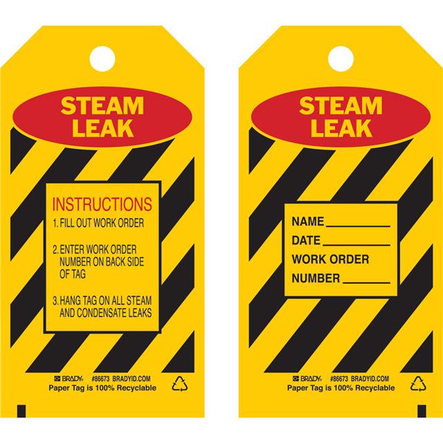 This is manufactured by Brady Corporation. The manufacturer part number is 86673. Label with a size of 5.75" l x 3.00" w (146.0mm x 76.2mm). The product is not applicable. It is shipped in bulk package . It has a classic black and red legend, yellow background colour. The product brady®, is a highly preferred choice for users. The product is made from highly stable and reliable paper. In addition, it is reach unaffected. Its typical moisture sensitivity level is not applicable. A bespoke label is a steamleak. instructions label. It has a long 4 weeks standard lead time.