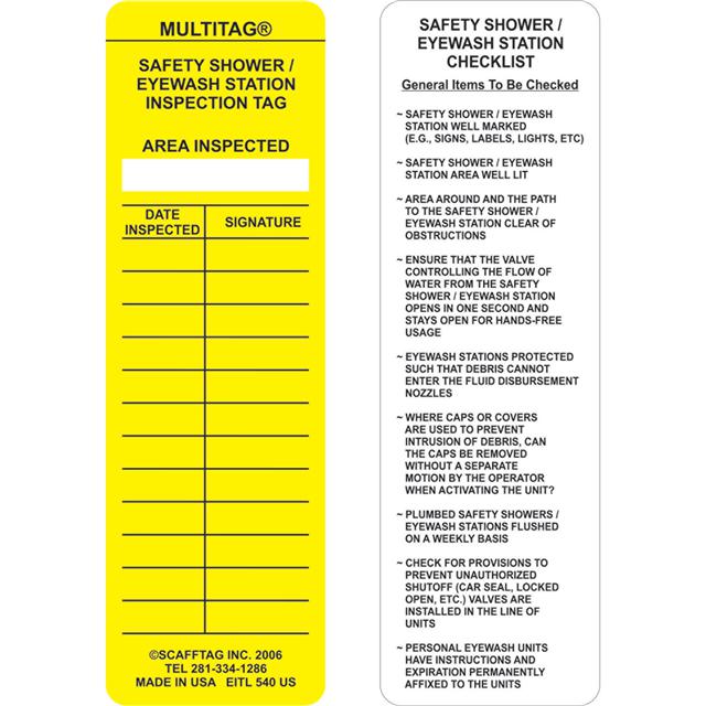 This is manufactured by Brady Corporation. The manufacturer part number is MUL-EITL 540. Label with a size of 6.50" l x 2.00" w (165.1mm x 50.8mm). The product is rohs3 compliant. It is shipped in bulk package . It has a classic black and yellow legend, white background colour. The product brady®, is a highly preferred choice for users. The product is made from highly stable and reliable polyester. In addition, it is reach unaffected. Its typical moisture sensitivity level is not applicable. A bespoke label is a multi tag safety shower/eye wash station inspection tag. multi tag safety shower/eye wash station inspection tag area inspecte… label. Moreover, it corresponds to mul-eitl, a base product number of the product. It has a long 4 weeks standard lead time.