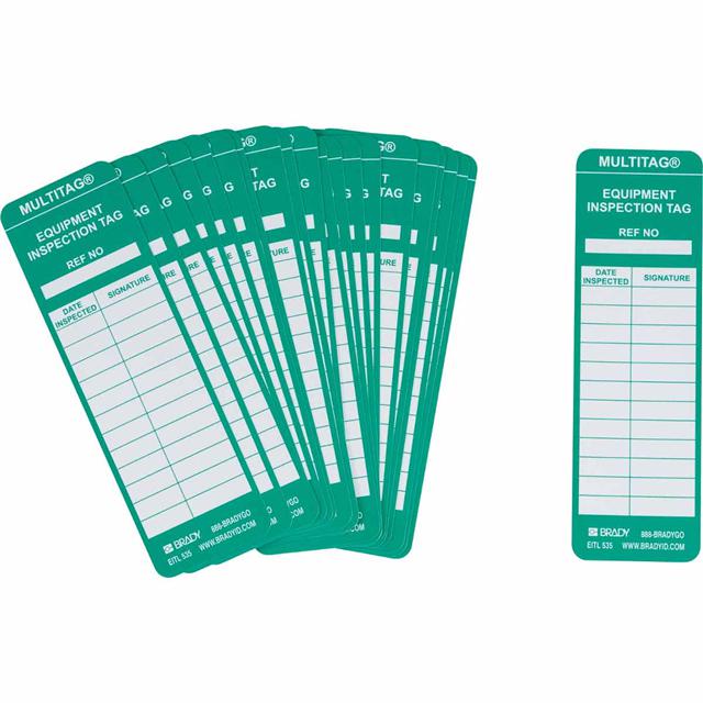 This is manufactured by Brady Corporation. The manufacturer part number is MUL-EITL535. Label with a size of 6.50" l x 2.00" w (165.1mm x 50.8mm). The product is rohs3 compliant. It is shipped in bulk package . It has a classic green legend, white background colour. The product brady®, is a highly preferred choice for users. The product is made from highly stable and reliable polyester. In addition, it is reach unaffected. Its typical moisture sensitivity level is not applicable. A bespoke label is a multi tag. multi tag equipment inspection tag ref no. date inspected. signature. label. Moreover, it corresponds to mul-eitl, a base product number of the product. It has a long 4 weeks standard lead time.