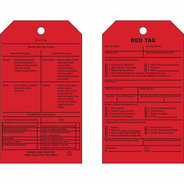 This is manufactured by Brady Corporation. The manufacturer part number is 81992. Label with a size of 7.00" l x 4.00" w (177.8mm x 101.6mm). The product is not applicable. It is assigned with possible HTSUS value of 4821.10.4000. It is shipped in bulk package . It has a classic black legend, red background colour. The product brady®, is a highly preferred choice for users. The product is made from highly stable and reliable paper. In addition, it is reach unaffected. Its typical moisture sensitivity level is not applicable. A bespoke label is a red tag. date identified. red tag file no. identified by. department. category. label. It has a long 4 weeks standard lead time. The product is designated with the ear99 code number.