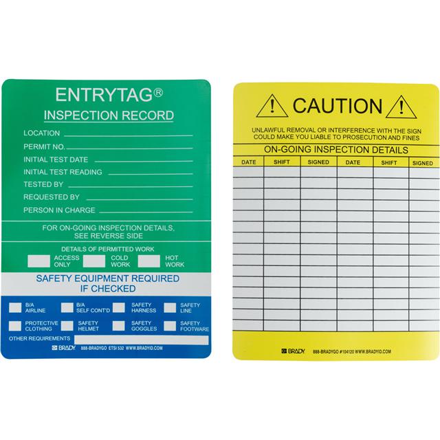 This is manufactured by Brady Corporation. The manufacturer part number is ENT-ETSI532. Label with a size of 7.63" l x 5.75" w (193.7mm x 146.1mm). The product is rohs3 compliant. It has a classic black, blue, green and yellow legend, white background colour. The product brady®, is a highly preferred choice for users. The product is made from highly stable and reliable polyester. In addition, it is reach unaffected. Its typical moisture sensitivity level is not applicable. In addition, bulk is the available packaging type of the product. A bespoke label is a entry tag inspection record. entry tag inspection record location. permit no. initial test date. initial test reading. tested … label. It has a long 4 weeks standard lead time. Moreover, it corresponds to ent-etsi, a base product number of the product. The brady corporation's product offers user-desired applications.
