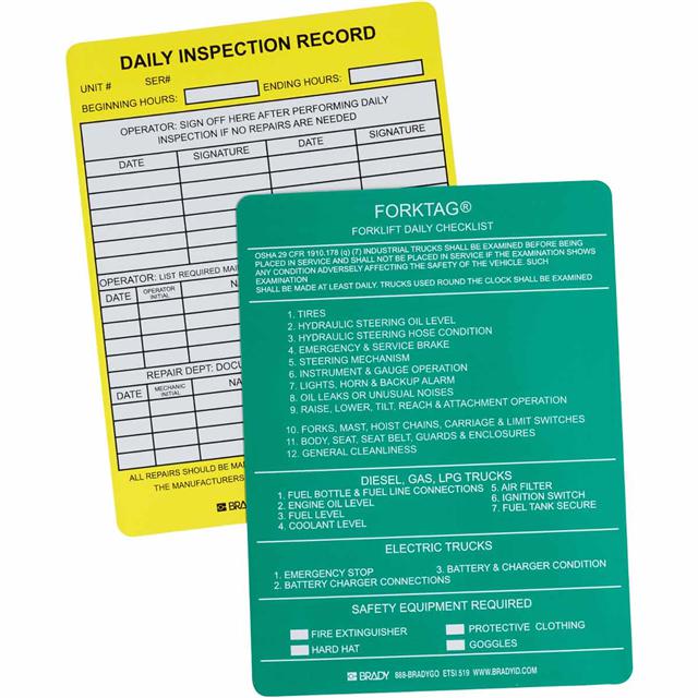 This is manufactured by Brady Corporation. The manufacturer part number is FLT-ETSI 519. Label with a size of 7.63" l x 5.75" w (193.7mm x 146.1mm). The product is rohs3 compliant. It is shipped in bulk package . It has a classic black, green and yellow legend, white background colour. The product brady®, is a highly preferred choice for users. The product is made from highly stable and reliable plastic. In addition, it is reach unaffected. Its typical moisture sensitivity level is not applicable. A bespoke label is a fork tag. fork tag fork tag daily check list label. Moreover, it corresponds to flt-etsi, a base product number of the product. It has a long 4 weeks standard lead time.