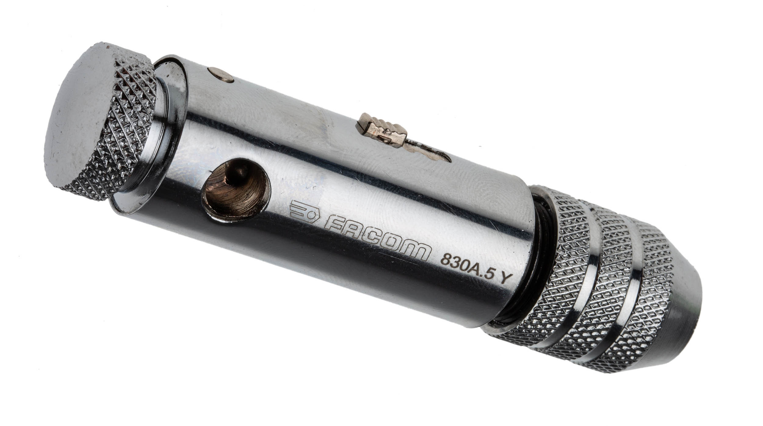 This is Two Way Ratchet Tap Wrench manufactured by Facom. The manufacturer part number is 830A.5. It has a typical thread size of m6. A quality product with a nice chrome finish. It comes in t-handle configuration.