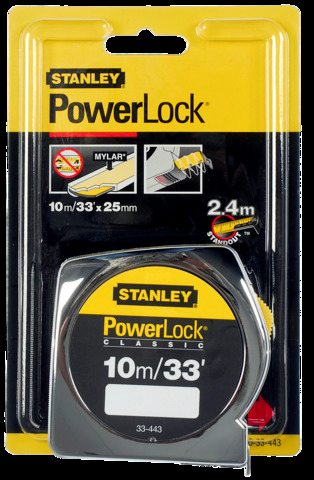 This is PowerLock Series 10m Tape Measure Metric & Imperial manufactured by Stanley. The manufacturer part number is 0-33-443. It is available in imperial, metric package. Its blade is 25 mm in width . The product powerlock, is a highly preferred choice for users. It is resistant to chemical no . Its accurate length is 10m. It is calibrated rscal . It is height safe no .