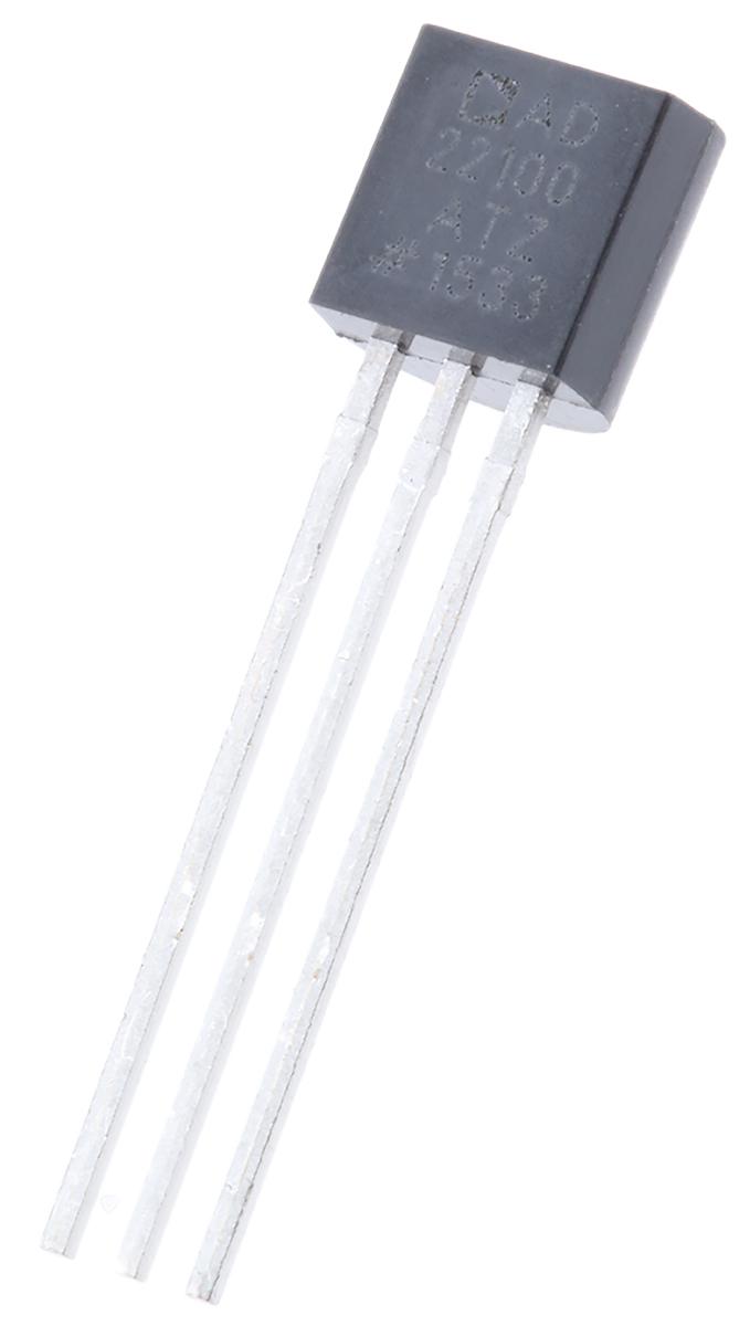 This is Temperature Sensor -40 → +85 °C ±1°C Analogue 3-Pin TO-92 manufactured by Analog Devices. The manufacturer part number is AD22100ATZ. It has 6.5 v maximum operating supply voltage. The given dimensions of the product include 5.21 x 4.19 x 5.33mm. The product is available in through hole configuration. The product has -40 to +85 °c of operating temperature range. While its minimum operating supply voltage is 4 v. Furthermore, it has aanalogue output. In addition, the height is 5.33mm. Furthermore, the product is 4.19mm wide. Its accurate length is 5.21mm. Its sensor is for temperature function . Its sensor gain is about 22.5mv/°c . It is a type of analogue interface. Whereas, the minimum operating temperature of the product is -40 °c. The package is a sort of to-92. It has a maximum operating temperature of +85 °c. It contains 3 pins. It provides high accuracy of ±1°c.