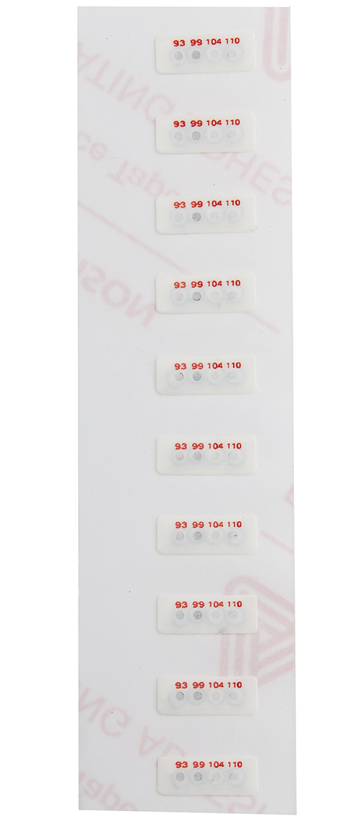 This is Non-Reversible Temperature Sensitive Label 93°C to 110°C 4 Levels manufactured by RS Pro. The manufacturer part number is 286-119. It includes 4 temperature levels . The product has a circle orientation. In addition, it has a standard label about 11mm in length . The product has a reversibility feature no . It has a maximum 110°c temperature sensitivity . It has 10 labels per product . It has a minimum 93°c temperature sensitivity . Its label is 4mm in width .
