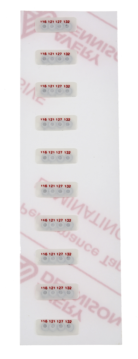 This is Non-Reversible Temperature Sensitive Label 116°C to 132°C 4 Levels manufactured by RS Pro. The manufacturer part number is 286-125. It includes 4 temperature levels . The product has a circle orientation. In addition, it has a standard label about 11mm in length . The product has a reversibility feature no . It has a maximum 132°c temperature sensitivity . It has 10 labels per product . It has a minimum 116°c temperature sensitivity . Its label is 4mm in width .