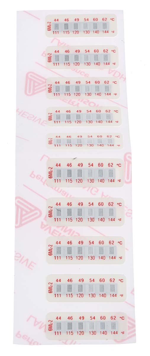 This is Non-Reversible Temperature Sensitive Label 44°C to 62°C 6 Levels manufactured by RS Pro. The manufacturer part number is 285-920. It includes 6 temperature levels . The product has a horizontal orientation. In addition, it has a standard label about 32mm in length . The product has a reversibility feature no . It has a maximum 62°c temperature sensitivity . It has 10 labels per product . It has a minimum 44°c temperature sensitivity . Its label is 12mm in width .