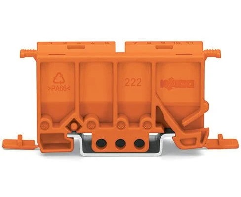 This is 222 Fixing Carrier for use with Compact Connector manufactured by Wago. The manufacturer part number is 222-500. The product is available in din rail configuration. The product 222, is a highly preferred choice for users. It has a decent orange colour. The product is made from highly stable and reliable polyamide. It is a type of mounting carrier accessory. The product is highly suitable for compact splicing connector.