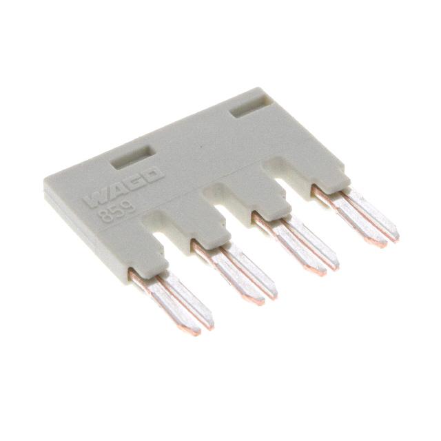 This is manufactured by WAGO Corporation. The manufacturer part number is 859-404. Additionally, the product is designed with flat pins Style. It is assigned with possible HTSUS value of 8536.90.4000. The product is rohs3 compliant. It comes in terminal block, cross connection configuration. The product carries possible position value of 4. In addition, it is reach unaffected. It is shipped in bulk package . Its typical moisture sensitivity level is 1 (unlimited). It has a long 8 weeks standard lead time. It has a classic gray colour. The product is suitable for use with terminal blocks. The product is designated with the ear99 code number. Moreover, it corresponds to 859, a base product number of the product.
