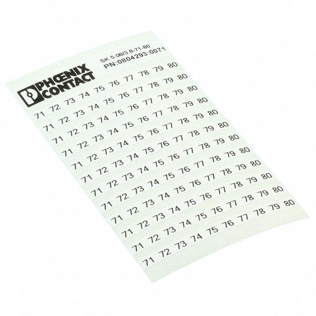 This is manufactured by Phoenix Contact. The manufacturer part number is 0804293:0071. It is assigned with possible HTSUS value of 3926.90.9989. It has a classic white colour. The product clipline, is a highly preferred choice for users. The product is rohs3 compliant. In addition, it is reach unaffected. Its typical moisture sensitivity level is 1 (unlimited). In addition, bulk is the available packaging type of the product. The product is suitable for use with clipline series. Moreover, the product is 0.200" (5.08mm). It has a long 4 weeks standard lead time. The phoenix contact's product offers user-desired applications. It comes in label, adhesive configuration. Legend Information: numbers, 71 through 80. The product is designated with the ear99 code number.