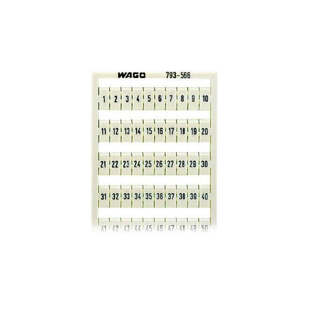 This is manufactured by WAGO Corporation. The manufacturer part number is 793-566. It is assigned with possible HTSUS value of 3926.90.9985. The product is rohs3 compliant. It has a classic white colour. The product wmb, is a highly preferred choice for users. In addition, it is reach unaffected. Its typical moisture sensitivity level is 1 (unlimited). In addition, bulk is the available packaging type of the product. The product is suitable for use with 5mm wide terminal blocks. It has a long 8 weeks standard lead time. The wago corporation's product offers user-desired applications. It comes in label, snap in configuration. Legend Information: numbers, 1 through 50. Moreover, it corresponds to 793, a base product number of the product. The product is designated with the ear99 code number.