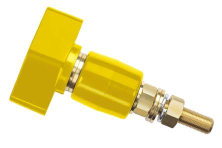 This is 4mm Yellow Terminal Post 1kV 200A M12 x 1 Thread manufactured by Schutzinger. The manufacturer part number is POL 201 / GE. The product is insulated yes . The product has a current rating of 200a. Moreover, the product has a nominal 1kv voltage rating. It has about 9mm maximum thickness of panel . It has a decent yellow colour. Its height above panel is approximately 76mm . It has a typical thread size of m12 x 1. The product's body is nicely designed from brass materials. Has a hole diameter of 4mm.