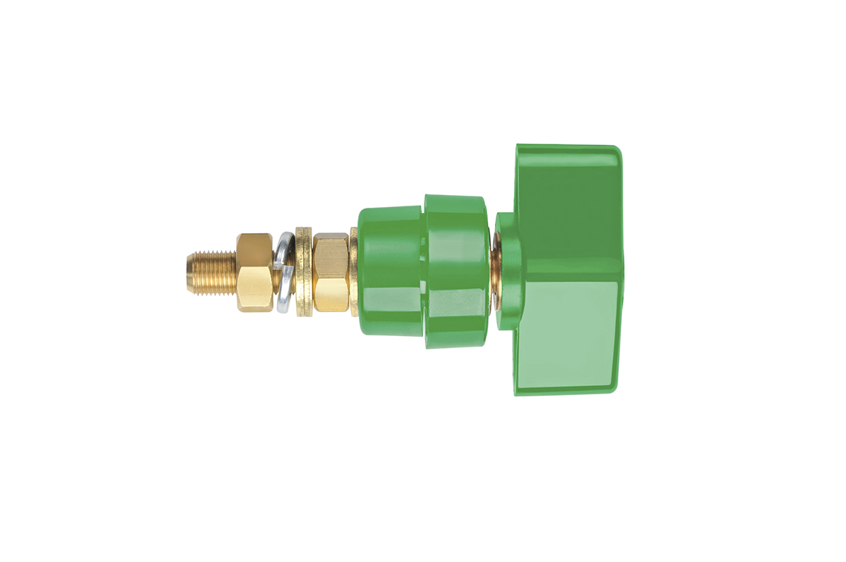This is Terminal post 1000 V 100 A manufactured by Schutzinger. The manufacturer part number is POL 102 L / GN. The product is insulated yes . The product has a current rating of 100a. Moreover, the product has a nominal 1kv voltage rating. It has about 4mm maximum thickness of panel . It has a decent green colour. Its height above panel is approximately 43mm . It has a typical thread size of m8 x 0.75. The product's body is nicely designed from brass materials. Has a hole diameter of 4mm.