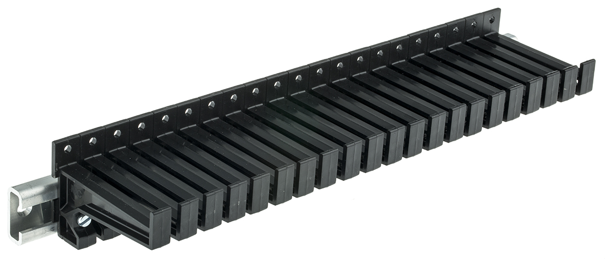 Multi-Contact Test Lead Rack From Multi-Contact, this test lead rack is a highly efficient, tangle-free way of storing test leads for easy retrieval. Mounted on a c-profile rail, the test lead holders can be repositioned to better suit the thickness of the test leads. The Multi-Contact test lead holder is easy to install, and a robust, practical solution to lead storage.