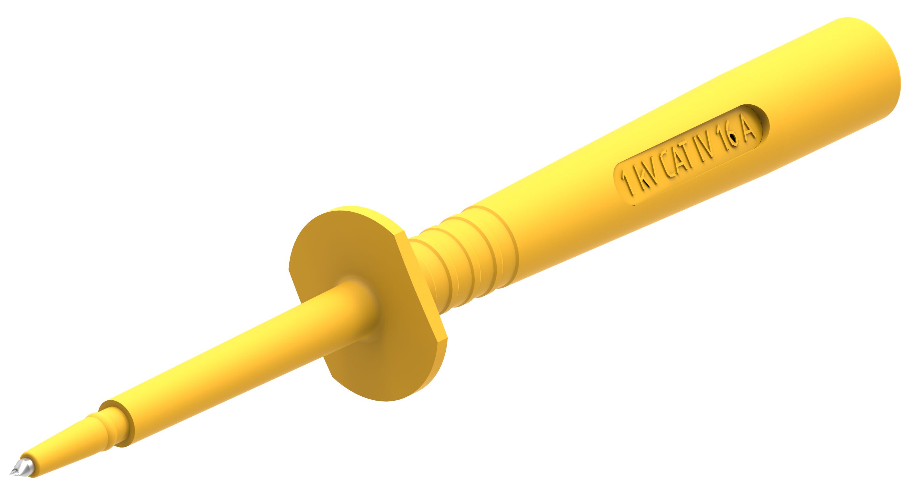 This is Narrow Test Probe 3.4mm Tip 1kV 16A manufactured by Electro PJP. The manufacturer part number is 402-IEC-CatIV-J. The tip is 3.4mm in size. The product has a current rating of 16a. Moreover, the product has a nominal 1kv voltage rating. It has a narrow type probe tip . It has a decent yellow colour. It has a needle point probe type of test probe .