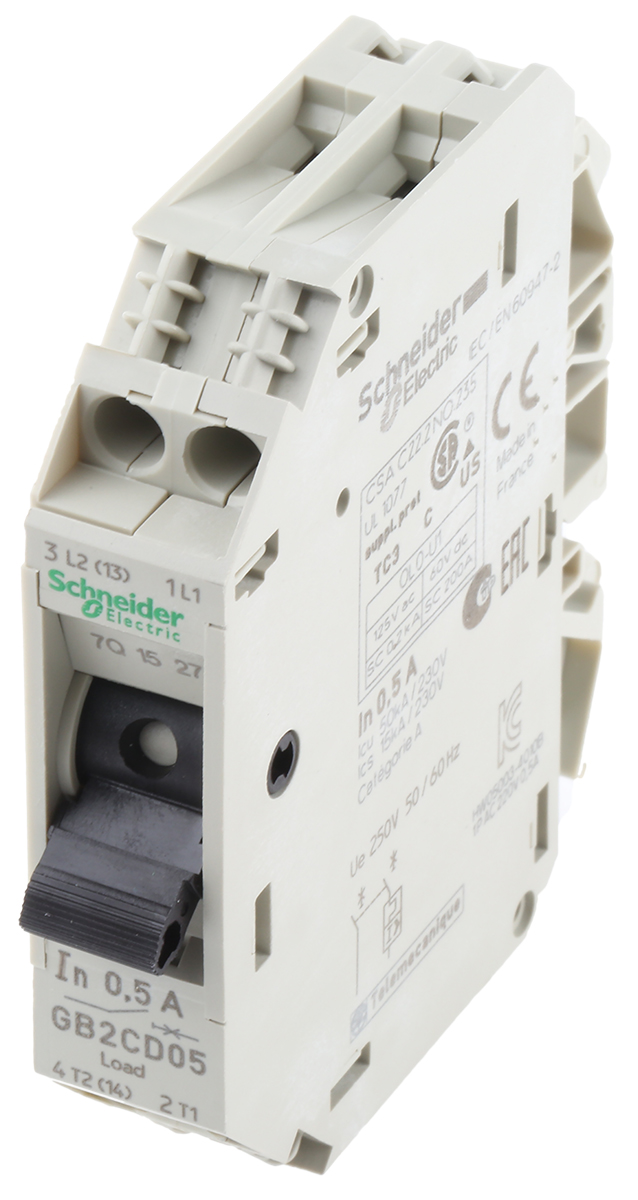 This is 500mA 1P + N Pole Thermal Magnetic Circuit Breaker 250V ac GB2 manufactured by Schneider Electric. The manufacturer part number is GB2CD05. The product has a current rating of 500ma. Moreover, the product has a nominal 250v ac voltage rating. The product gb2, is a highly preferred choice for users. This is a type of thermal magnetic circuit breaker, a circuit breaker with unique features. Furthermore, the product has an overall dimensions of 74 x 15 x 82mm. The product has 1 (dc) ka, 50 (ac) ka breaking capacity at maximum voltage rating. The product is available in din rail mount style. Furthermore, the product is 15mm wide. It has an overall length of 74mm. Similarly, the product has 82mm of overall depth. It has equipped with 1p + n poles.