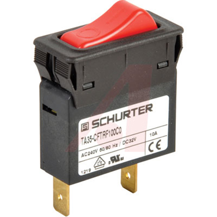 This is 10A 1 Pole Thermal Magnetic Circuit Breaker 32 V dc 240 V ac TA35 manufactured by Schurter. The manufacturer part number is 4435.0056. The product has a current rating of 10a. In addition, It features 34 x 14.5mm of mounting hole size. Moreover, the product has a nominal 32 v dc, 240v ac voltage rating. It utilises thermal tripping mechanism. The product ta35, is a highly preferred choice for users. This is a type of thermal magnetic circuit breaker, a circuit breaker with unique features. Furthermore, the product has an overall dimensions of 17.5 x 40.7 x 36mm. The terminal contact is kind of quick connect. The product has a rated DC voltage of 32v. The product is available in snap in style. Applications Information involves cleaning equipment, commercial and household kitchen appliances, equipment for construction, industrial appliances, power tools. The product has 2 ka breaking capacity at maximum voltage rating. It has an overall length of 17.5mm. Similarly, the product has 36mm of overall depth. It has equipped with 1 poles. It is a rocker reset actuator.