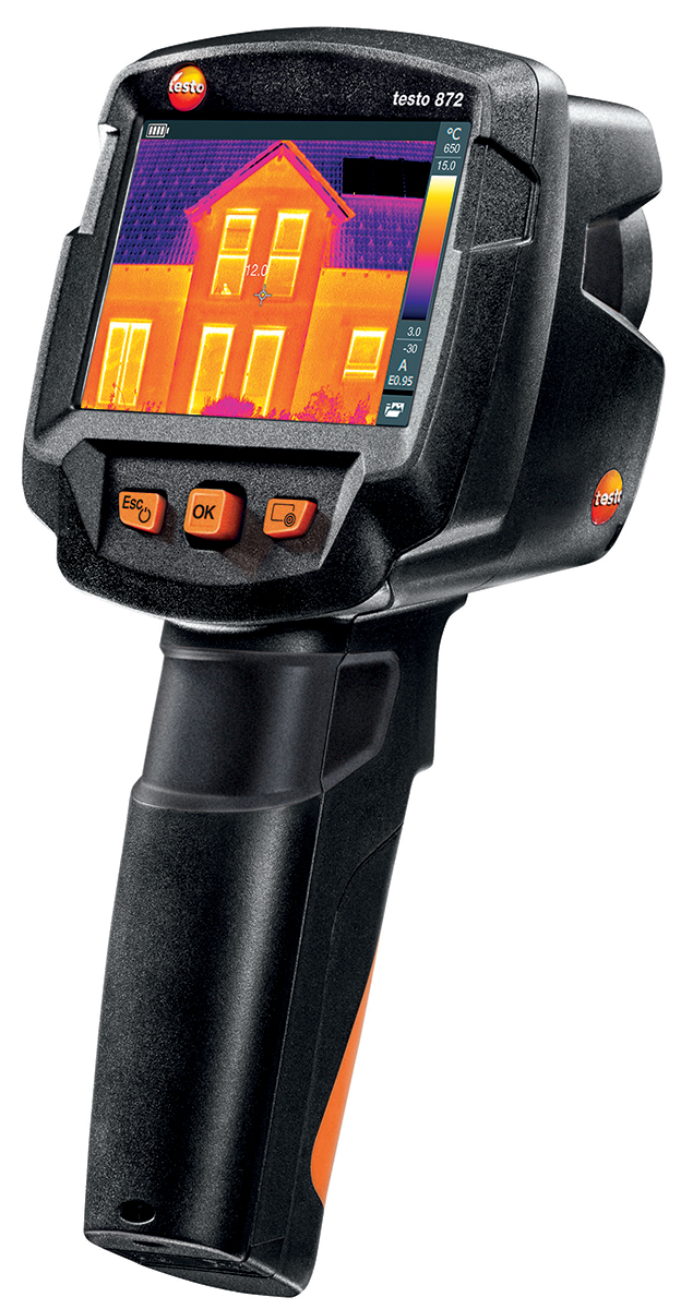 This is 872 Thermal Imaging Camera Temp Range: 0 → +650 °C -30 → +100 °C 320 x 240pixel manufactured by Testo. The manufacturer part number is 0560 8721. The product is designed with a standard 320 x 240pixel display resolution . Moreover, it has a minimum 0.5m focus distance . It has about ±2 °c best temperature measurement accuracy . The typical product's weight is 510g. It has about 0 → +650 °c, -30 → +100 °c temperature measurement range . Its focus type is fixed . While it has 872 of model number. With 9hz refresh rate . It has a model number 872. Applications Information involves thermography. It is calibrated rscal . Moreover, it has a minimum focus factor of 0.5 m . Additionally, it has a detector resolution of 320 x 240pixel . It is tailored with a standard 3.5in size display . The product has 60mk thermal sensitivity .