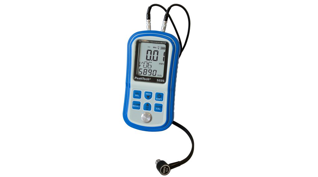 This is P 5225 Thickness Meter 1.00mm - 300.0mm 1 % Accuracy 0.01 mm Resolution LCD Display manufactured by PeakTech. The manufacturer part number is P5225. It features a remarkable lcd display. It has a minimum 1.00mm measurement capacity . While it has p 5225 of model number. It has a maximum 300.0mm measurement . Supplied with 5mhz of frequency. Features 0.01 mm resolution. It provides high accuracy of 1 %.
