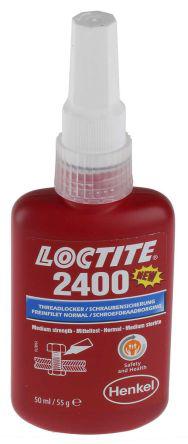 This is LOCTITE 2400 Blue Threadlocking Adhesive 2 h Cure 50 ml manufactured by Loctite. The manufacturer part number is Loctite 2400 50ml. It is assigned with a trade name of loctite 2400. Its actual cure time is about 24 h . The viscosity measurement of the product is 1300 → 3000mpa/s . Whereas, the minimum operating temperature of the product is -55°c. The product has -55 → +150 °c of operating temperature range. The product is in liquid form . It has a decent blue colour. Additionally, it has approximately 10min time setting . Its odour is characteristic . Moreover, it has medium viscosity viscosity description . It has a/an metal material compatibility . Applications Information involves threadlocking. It has about 1.1 specific gravity . The package is a sort of bottle. It contains dimethacrylate ester chemical composition . Its package size is approximately 50 ml . It has a medium thread locking strength . The product also provides special features, such as anaerobic. It has a maximum operating temperature of +150°c. It is anaerobic yes .
