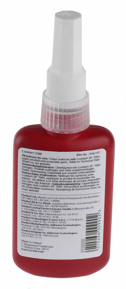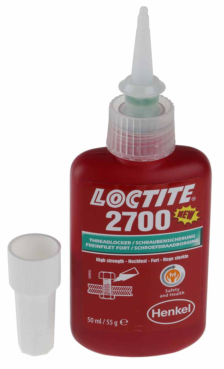 This is 2700 Green Threadlocking Adhesive 50 ml 24 h Cure Time manufactured by Loctite. The manufacturer part number is 1948762. It is assigned with a trade name of loctite 2700. Its actual cure time is about 24 h . The viscosity measurement of the product is 350 → 550mpa/s . The product has -55 → +150 °c of operating temperature range. The product is in liquid form . It has a decent green colour. Its odour is characteristic . Moreover, it has low viscosity viscosity description . It has a/an metal material compatibility . Applications Information involves threadlocking. It contains dimethacrylate ester chemical composition . The package is a sort of bottle. Whereas, the minimum operating temperature of the product is -55°c. Its package size is approximately 50 ml . It has a high thread locking strength . The product also provides special features, such as anaerobic. It has a maximum operating temperature of +150°c. It is anaerobic yes .