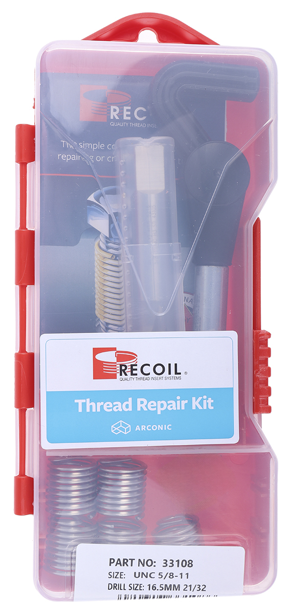 This is 7 piece 5/8-11 Thread Repair Kit manufactured by Recoil. The manufacturer part number is 33108. It has a thread size range of 5/8-11 . Moreover, it has 5/8 in unc inserts (x5); standard installation tool set contents . The product consists of 7 pieces.