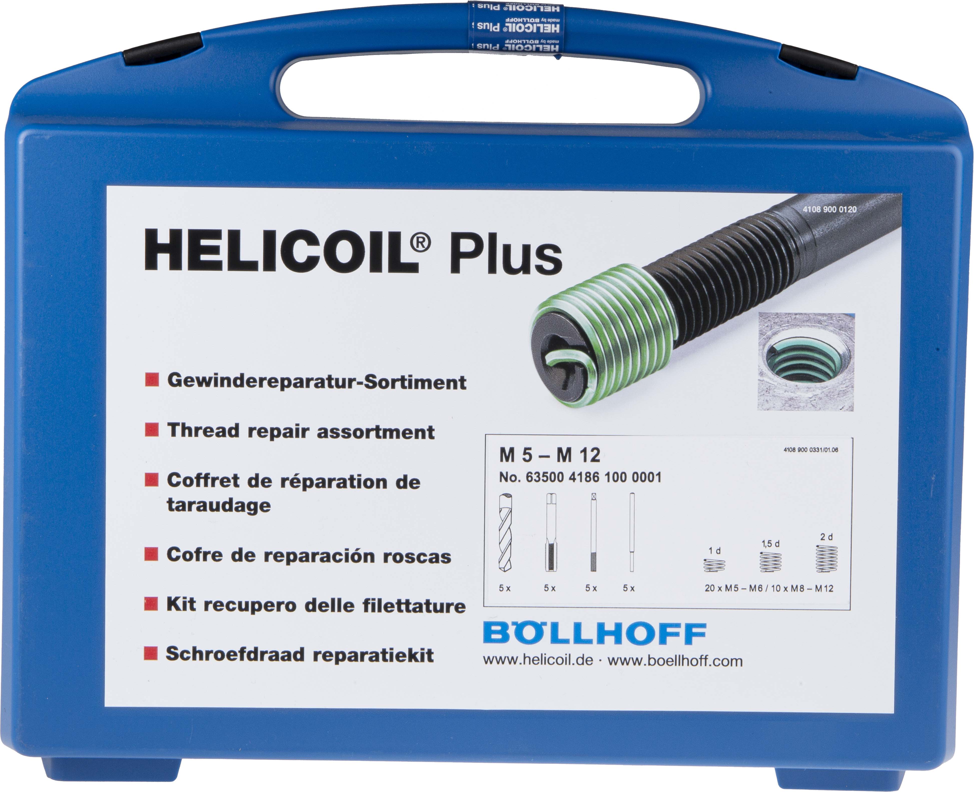 Thread repair kit - HELICOIL® plus M5 - M12 This kit is used to recover and repair damaged threads. Kit contents: different lengths and dimensions of HELICOIL® plus threaded inserts, drill bits, HSS manual threads, manual pins, tang breakers. Green colour to check the thread is present after fitting. Thread Pitch No. of threaded inserts M 5 x 5 0.8 20 M 5 x 7.5 0.8 20 M 5 x 10 0.8 20 M 6 x 6 1 20 M 6 x 9 1 20 M 6 x 12 1 20 M 8 x 8 1.25 10 M 8 x 12 1.25 10 M 8 x 16 1.25 10 M 10 x 10 1.5 10 M 10 x 15 1.5 10 M 10 x 20 1.5 10 M 12 x 12 1.75 10 M 12 x 18 1.75 10 M 12 x 24 1.75 10