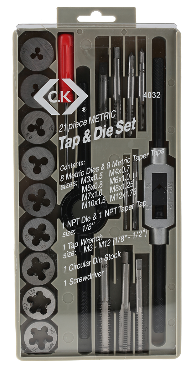This is 21 Piece Carbon Steel Thread Tap & Die Set manufactured by CK. The manufacturer part number is T4032. It has a minimum die size of approximately 1/8 in npt . With a/an 1/8 in npt maximum tap size . The product is made from highly stable and reliable carbon steel. Furthermore, it has a/an 1/8 in npt maximum die size . Moreover, it has taps & dies set contents . It has a minimum tap size about 1/8 in npt . The product consists of 21 pieces.