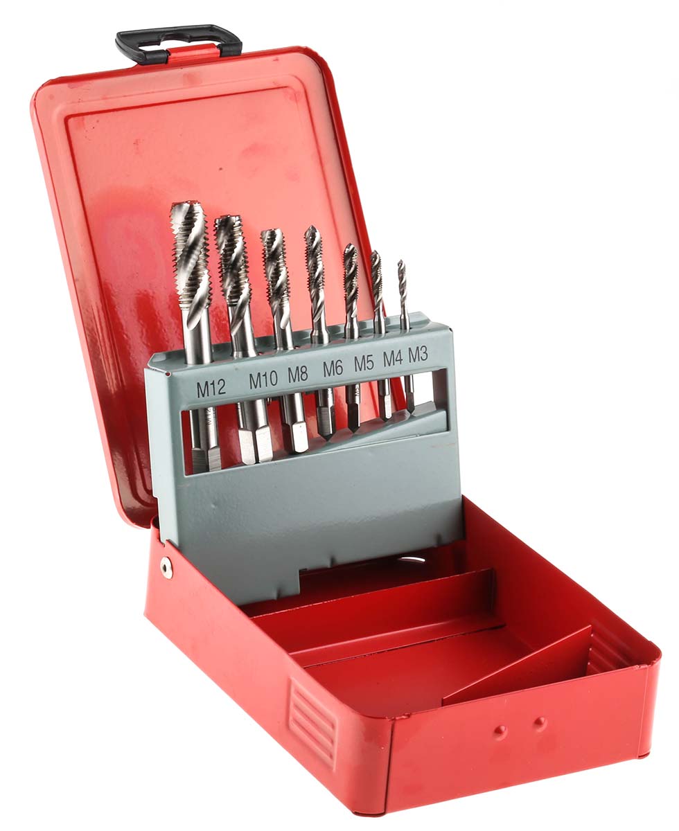 This is 7 Piece M12 HSS Spiral Flute Tap Set M3; M4; M5; M6; M8; M10; M12 manufactured by RS Pro. The manufacturer part number is 427-931. It has a/an iso shank standard . It has a typical thread size of m3 → m12. It has a hand tap . It has a plain type shank . The threaded is a metric standard. The product is made from highly stable and reliable hss. This is a type of threading tap set, a set with user-desired tools. Its thread direction is to the right hand . It comes in spiral flute configuration. The product consists of 7 pieces.