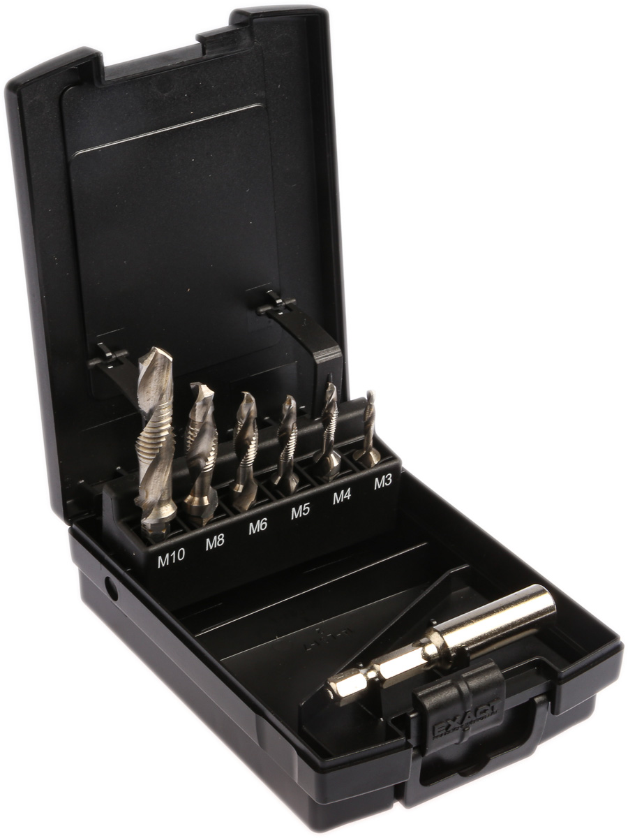 The EXACT 05910 is a 7-piece high-speed steel combination threading tap set, covering thread sizes M3, M4, M5, M6, M8, and M10—with a ¼″ hex adapter included. Designed for “combination” operation, each tool can drill, tap, and deburr in a single pass, streamlining workflow. The robust design allows use in materials up to ~700 N/mm², making it a versatile set for professionals in metalwork, fabrication, and maintenance.