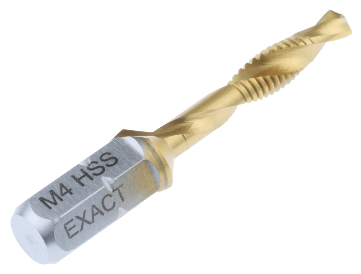 This is HSS M4 Spiral Flute Thread Tap 39 mm Length manufactured by EXACT. The manufacturer part number is 4405922. It has a typical thread size of m4. The threaded is a metric standard. The product is made from highly stable and reliable hss. It has an overall length of 39 mm. This is a type of threading tap, a set with user-desired tools. In addition, its shank diameter is about 0.25 in . Moreover, the product is 0.7mm. The product is highly suitable for 825-25. Its thread direction is to the right hand . It comes in spiral flute configuration. The product consists of 1 pieces.