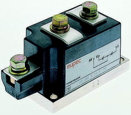 This is Thyristor Module SCR 261A 1800V 7-Pin Module 50mm manufactured by Infineon. The manufacturer part number is TT250N12KOFHPSA1. Moreover, it has a repetitive peak forward blocking voltage about 1200v . It has about 1800v repetitive reverse voltage . It has a peak on-state voltage about 1.5v . The given dimensions of the product include 115 x 52 x 50mm. The product is available in panel mount configuration. It has about 8000a surge current rating . Moreover, it has about 261a rated average on-state current . In addition, the height is 50mm. Furthermore, the product is 52mm wide. Its accurate length is 115mm. Its repetitive peak off-state current is approximately 50ma . The package is a sort of module 50mm. Whereas, the minimum operating temperature of the product is -40 °c. The product has a maximum 300ma holding current . In addition, the product has a maximum 200ma gate trigger current . In addition, the product has a/an scr type thyristor . It has a maximum operating temperature of +125 °c. It contains 7 pins. Moreover, it has a maximum 2v gate trigger voltage .