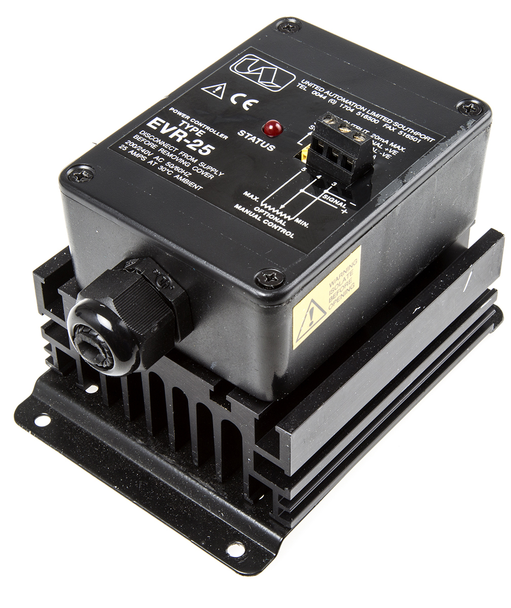 This is AC Phase Angle Controller 25A 87 x 95 x 146mm manufactured by United Automation. The manufacturer part number is EVR-25PA. The product is available in screw mount configuration. It has a maximum operating temperature of +65 °c. The product has a current rating of 25a. The given dimensions of the product include 87 x 95 x 146mm.