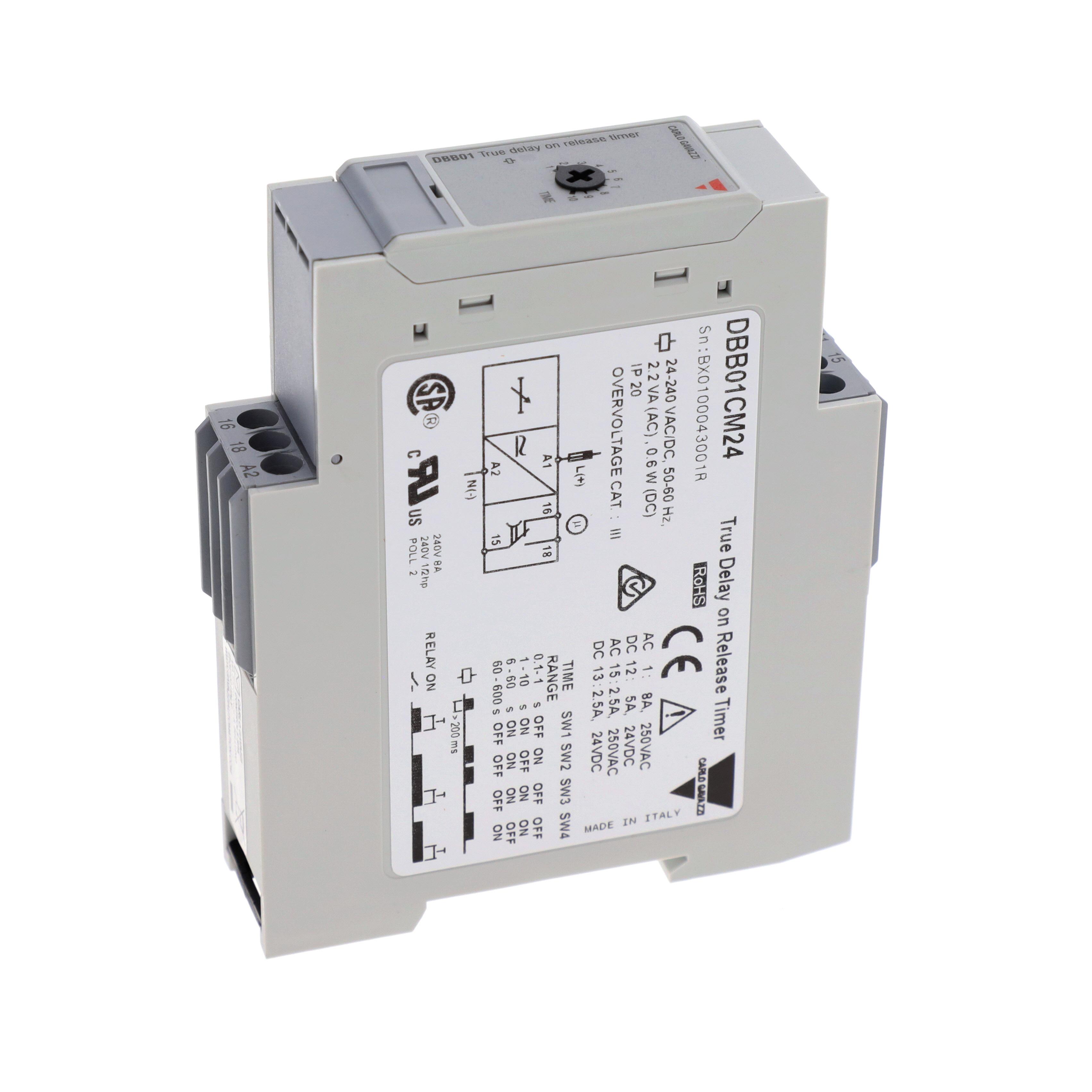 This is manufactured by Carlo Gavazzi Inc.. The manufacturer part number is DBB01CM24. It is assigned with possible HTSUS value of 9107.00.8000. This is basically a mechanical relay. Moreover, it has screw terminal terminal style. It has input voltage mechanism for timing initiation. It performs basic function of off-delay. In addition, it is reach unaffected. It is shipped in box package . Its typical moisture sensitivity level is not applicable. It has an integral spdt (1 form c) circuit. The given contact rating of the product and its voltage includes 8a @ 250vac. It has a long 6 weeks standard lead time. A product has a 0.1 sec ~ 600 sec delay time. While the timing adjustment mechanism includes screwdriver slot. The product is available in din rail configuration. The product dbb01, is a highly preferred choice for users. It has optimum voltage supply of 24 ~ 240vac/dc. Moreover, it corresponds to dbb01, a base product number of the product. The product is designated with the ear99 code number.