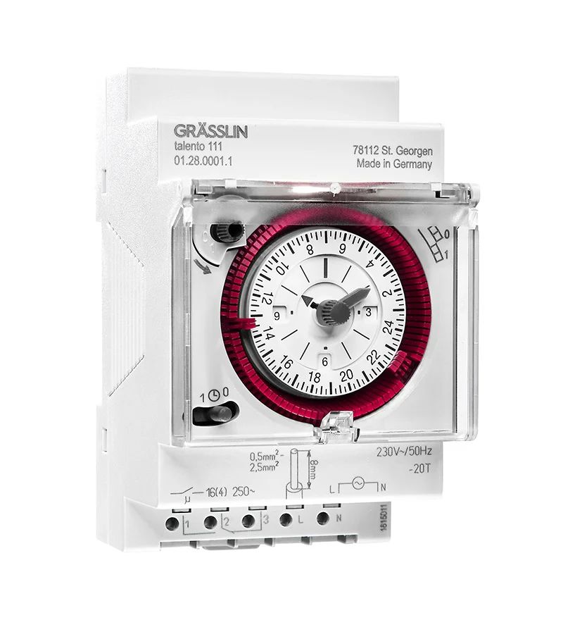 This is 1 Channel Analogue DIN Rail Switch Measures Hours Minutes Seconds 220 → 240 V manufactured by Grasslin. The manufacturer part number is 01.28.0001.1. It measures in hours units . Its segment length is approximately 15 min . It is supplied with 1 channels. Features 230 v ac supply voltage. It comes in analogue configuration.