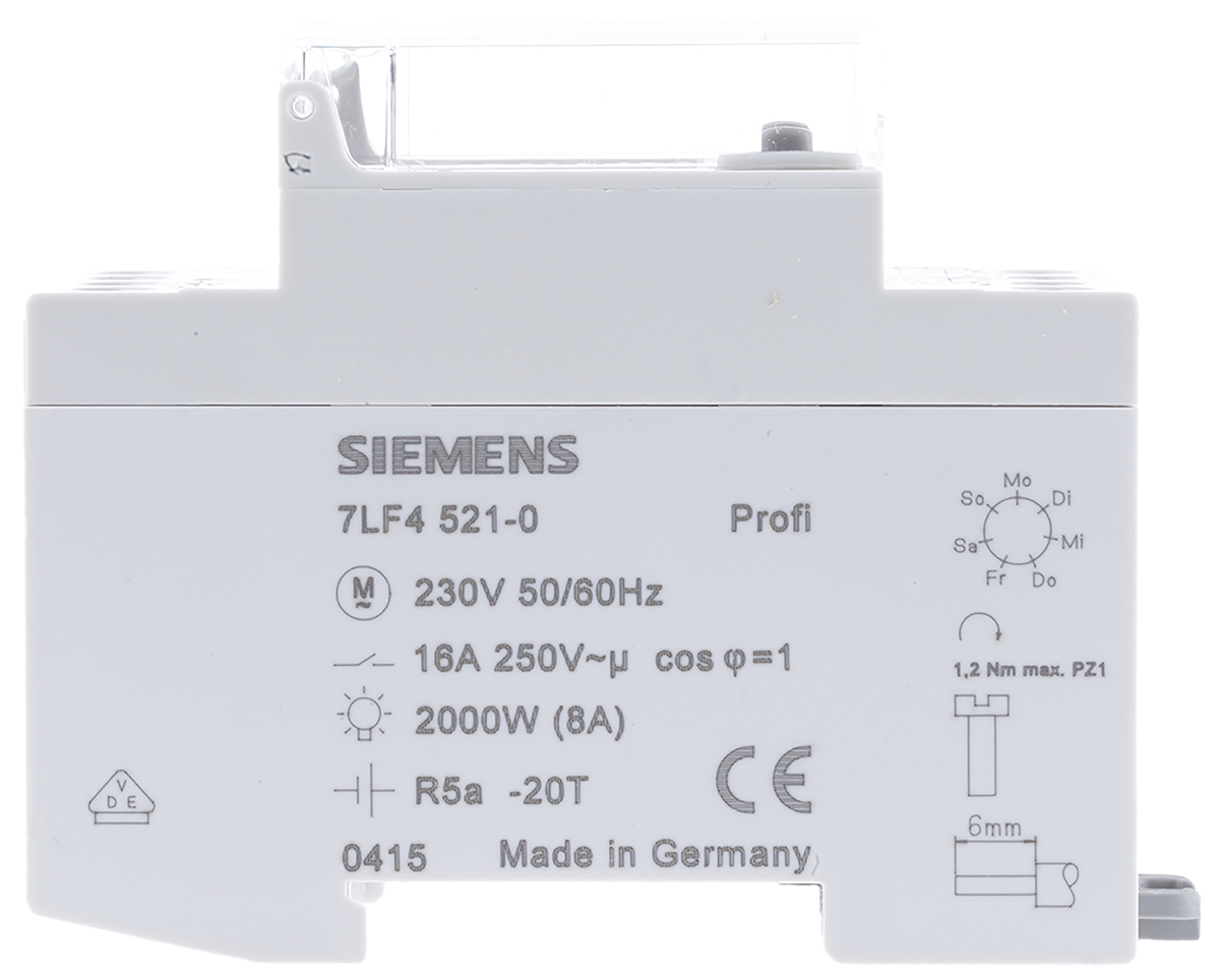 This is 1 Channel Digital DIN Rail Switch Measures Days 230 V ac manufactured by Siemens. The manufacturer part number is 7LF4521-0. It measures in days units . Its segment length is approximately 1 s . In addition, the height is 83mm. The product comes in 70mm depth. It is supplied with 1 channels. Features 230 v ac supply voltage. It includes 56 memory spaces . The contact is equipped with spdt configuration. It comes in digital configuration.