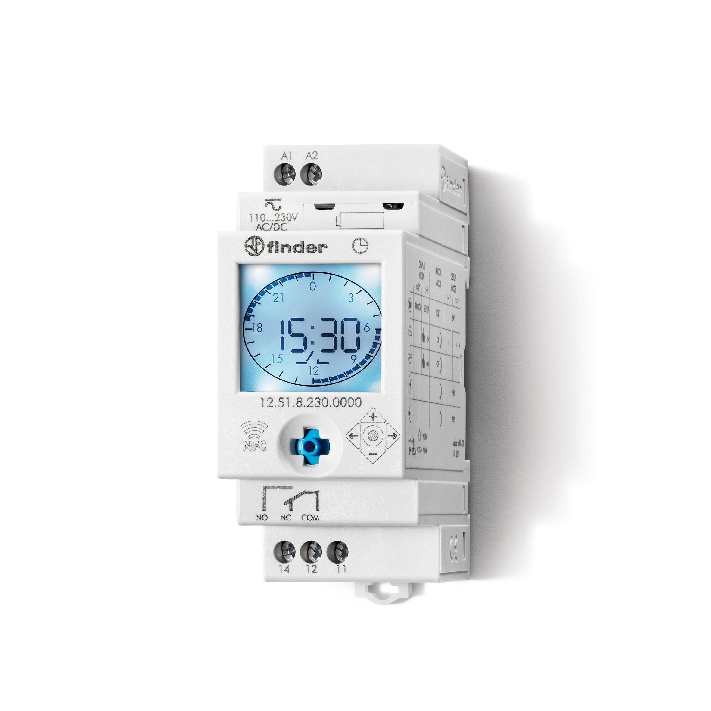 This is Digital with NFC DIN Rail Switch Measures Hours Minutes 110 → 240 V ac manufactured by Finder. The manufacturer part number is 12.51.8.230.0000 NFC. It measures in hours, minutes units . In addition, the height is 88.8mm. The product comes in 60.8mm depth. Its battery life is about 6yr . Features 110 → 230 v ac supply voltage. The contact is equipped with spdt configuration. It comes in digital with nfc configuration.