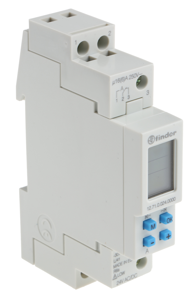 This is 1 Channel Digital DIN Rail Switch Measures Minutes 24 V ac/dc manufactured by Finder. The manufacturer part number is 12.71.0.024.0000. It measures in minutes units . Its segment length is approximately 1 min . In addition, the height is 90mm. The product comes in 60mm depth. Its battery life is about 6yr . It is supplied with 1 channels. Features 24 v ac/dc supply voltage. It includes 30 memory spaces . The contact is equipped with spdt configuration. It comes in digital configuration.