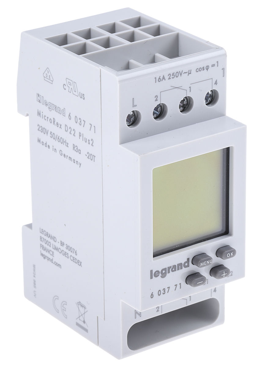 This is 2 Channel Digital DIN Rail Switch Measures Hours Minutes Seconds 230 V ac manufactured by Legrand. The manufacturer part number is 6 037 71. It measures in hours, minutes, seconds units . The contact is equipped with spdt configuration. Its battery life is about 3yr . It is supplied with 2 channels. Features 230 v ac supply voltage. It comes in digital configuration.