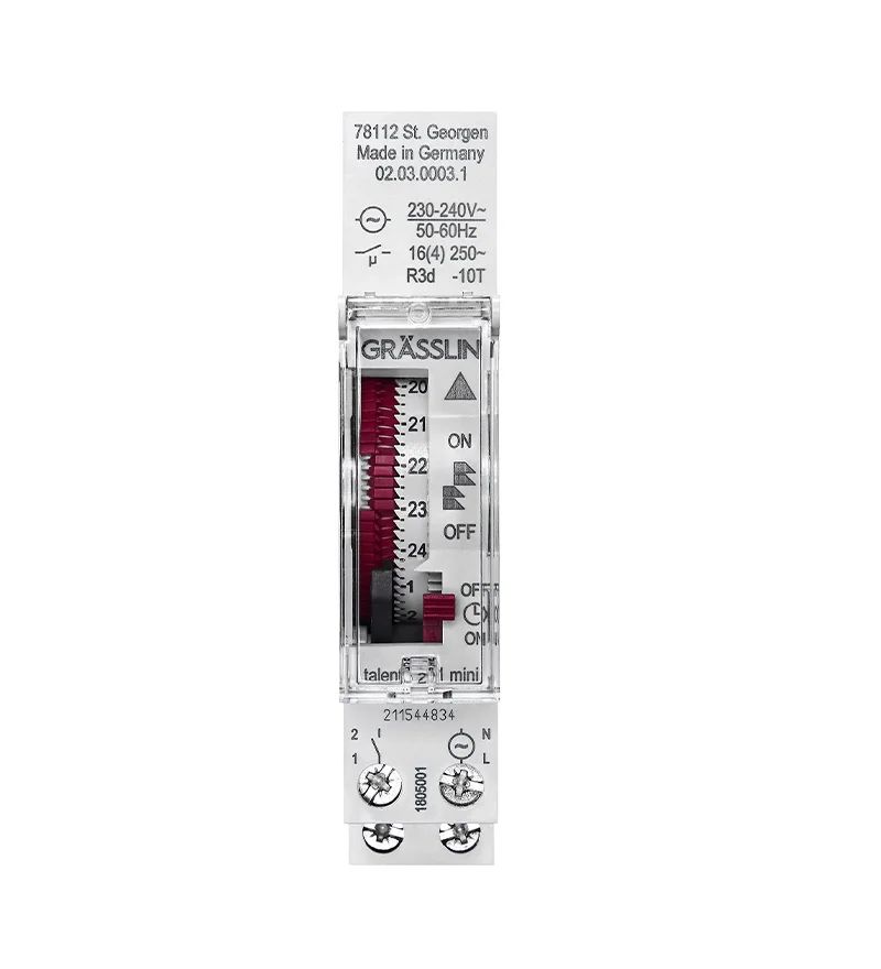 This is 1 Channel Analogue DIN Rail Switch Measures Minutes 110 V dc 230 V ac manufactured by Grasslin. The manufacturer part number is 02.03.0003.1. It measures in hours units . Its segment length is approximately 15 min . It is supplied with 1 channels. Features 230 → 240 v ac supply voltage. It comes in analogue configuration.
