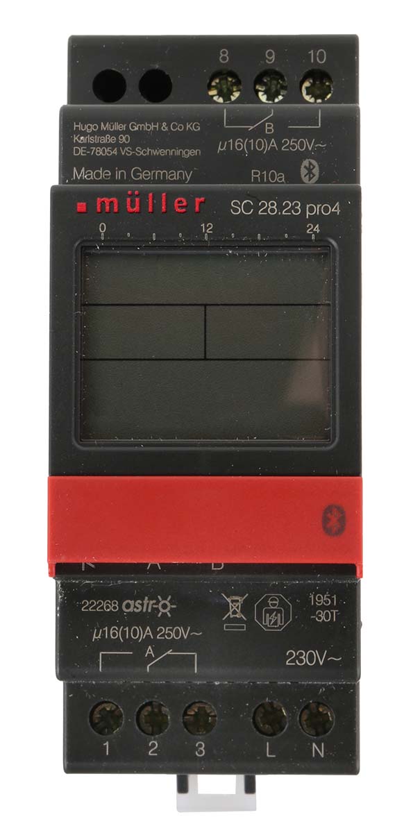 This is Digital DIN Rail Time Switch 230 V ac 2-Channel manufactured by Muller. The manufacturer part number is SC 28.23 PRO4 230V. It measures in minutes units . Its segment length is approximately 1 min . In addition, the height is 90mm. The product comes in 63mm depth. Its battery life is about 10yr . It is supplied with 2 channels. Features 230 v ac supply voltage. It includes 60 memory spaces . The contact is equipped with dpdt configuration. It comes in digital configuration.