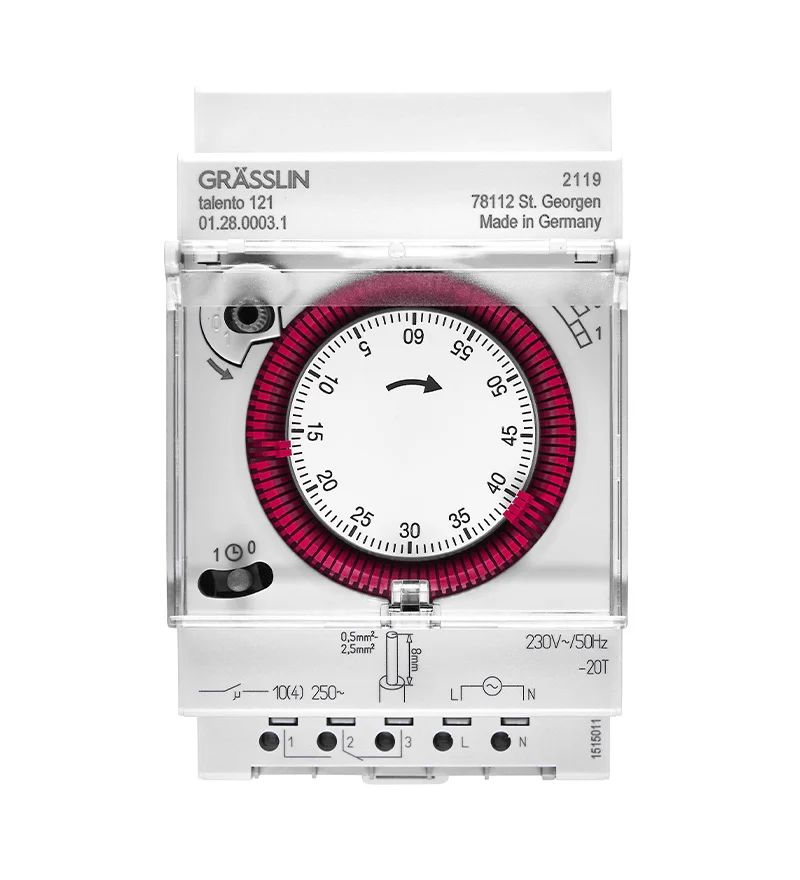 This is Analogue DIN Rail Time Switch 230 V ac 1-Channel manufactured by Grasslin. The manufacturer part number is 01.28.0003.1. It is supplied with 1 channels. It measures in minutes units . It comes in analogue configuration. Features 230 v ac supply voltage. Its segment length is approximately 37.5 sec .