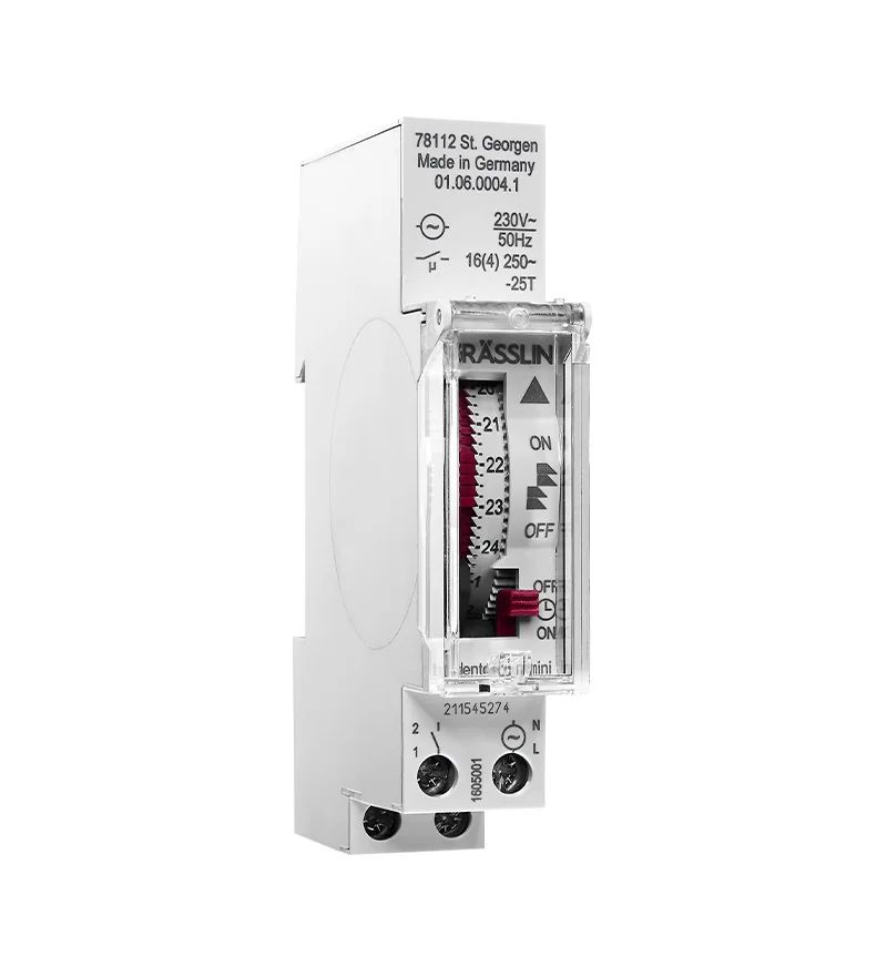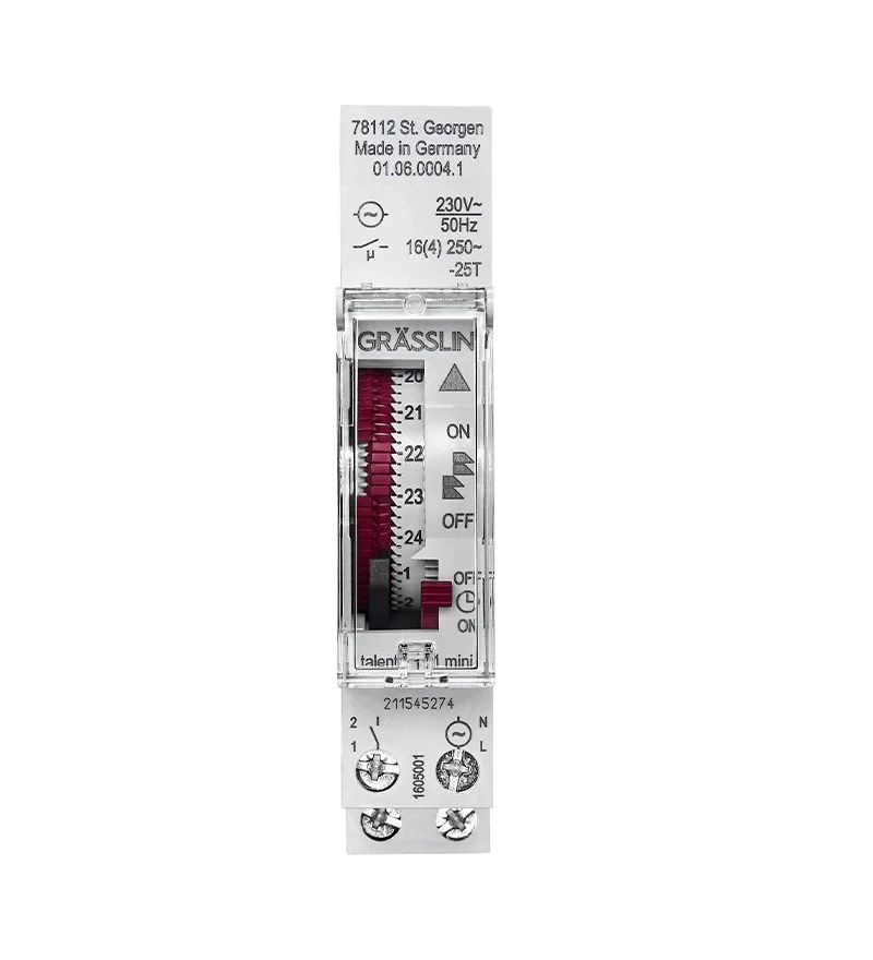 This is Analogue DIN Rail Time Switch 230 V ac 1-Channel manufactured by Grasslin. The manufacturer part number is 01.06.0004.1. It measures in hours units . Its segment length is approximately 15 min . It is supplied with 1 channels. Features 230 v ac supply voltage. It comes in analogue configuration.